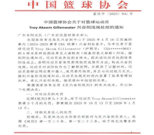 早在六月份的時候,中國反興奮劑中心公布了CBA球員的興奮劑違規(guī)情況,前廣東男籃的外援吉倫沃特在4月16日的賽后檢查中,A樣本檢測呈大麻酚類陽性,且其放棄了檢測B樣本,構(gòu)成了興奮劑違規(guī),這件事引發(fā)了眾多媒體和球迷的熱議。經(jīng)過了三個月的調(diào)查后,中國籃協(xié)發(fā)布官宣,表示吉倫沃特的事情已經(jīng)調(diào)查清楚,并公布了處罰結(jié)果。