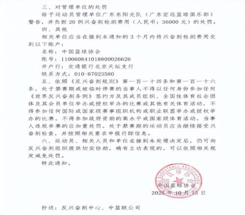 按照籃協(xié)公布的消息,在調(diào)查過程中,吉倫沃特對檢查結(jié)果進行了說明,并提供了相關(guān)證據(jù)材料,能夠證明其是在賽外攝入、使用禁用物質(zhì),與提升運動能力無關(guān)。接到興奮劑違規(guī)通知后,吉倫沃特在規(guī)定時間內(nèi)簽署了結(jié)果管理回執(zhí)單,承認興奮劑違規(guī),接受通知中指控的結(jié)果。為此籃協(xié)對吉倫沃特做出了禁賽三個月的處罰;隊醫(yī)林志達作為廣東男籃醫(yī)療與反興奮劑負責人,給予警告處分;廣東男籃監(jiān)管方面不到位,被處于警告處分,并承擔20例興奮劑檢測費用36000元。在這則通告的最后,籃協(xié)還有另外一句話,那就是“運動員、相關(guān)人員和單位如果能夠向反興奮劑組織提供切實協(xié)助,確有立功表現(xiàn)的,可以依照規(guī)定減免處罰?!?/p>