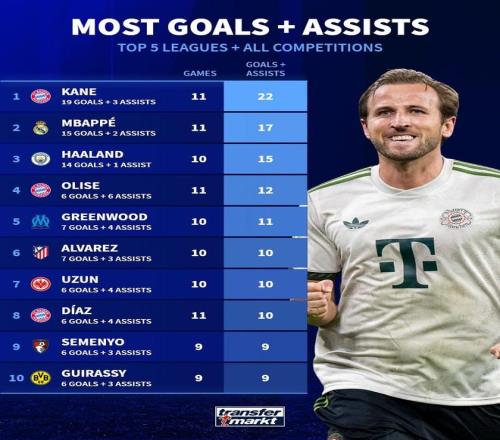 1.凱恩 22球 拜仁 (11場比賽19球3助攻)
