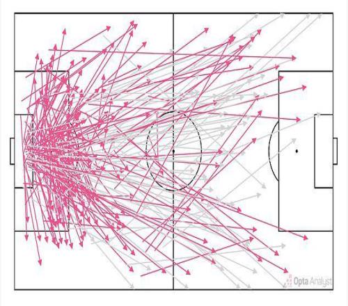 拉亞本賽季嘗試了多種傳球方式,必要時(shí)送出長(zhǎng)傳(成功傳球用彩色標(biāo)注,未成功傳球用灰色標(biāo)注)。