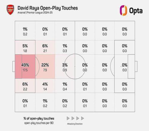 隨著阿爾特塔逐漸向英超新趨勢(shì)靠攏——直接打法,尤其是有了速度快的鋒線尖刀哲凱賴什和善于沖擊防線的新援埃澤與馬杜埃凱——拉亞的長(zhǎng)傳球出現(xiàn)得更加頻繁。