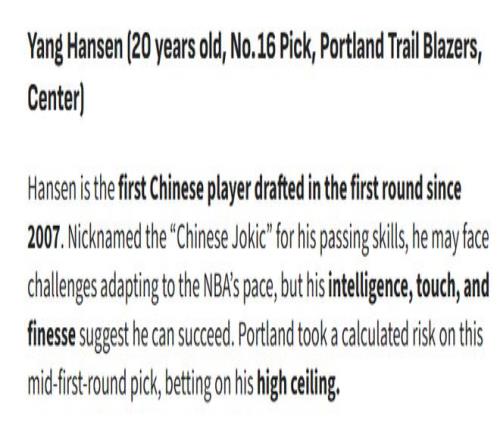 瀚森是2007年以來首位在首輪被選中的中國球員。因出色的傳球能力,他被冠以“中國約基奇”的稱號。盡管可能面臨適應(yīng)NBA節(jié)奏的挑戰(zhàn),但他的球商、手感與技巧都預(yù)示著他有能力在聯(lián)盟立足。開拓者隊(duì)在首輪中段選中他,是一次經(jīng)過深思熟慮的冒險,賭的正是他的高上限。