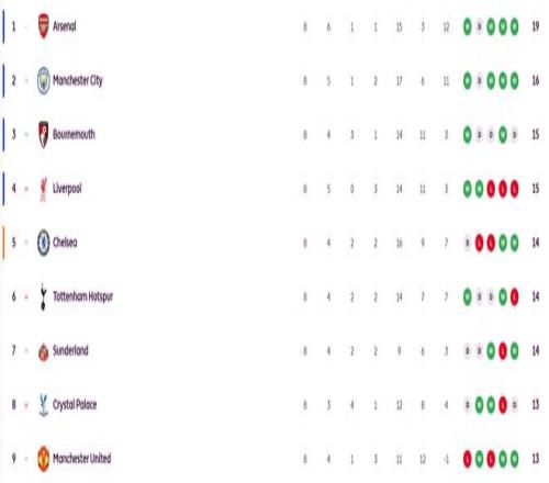 英超最新積分榜方面,阿森納8輪6勝1平1分以19分領(lǐng)跑,曼城16分第二落后槍手3分。利物浦各項(xiàng)賽事遭遇四連敗,其中英超三連敗,已經(jīng)從榜首跌至第四。伯恩茅斯和紅軍同積15分,排在第3。曼聯(lián)全取三分后攀升至第9的位置。