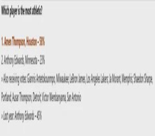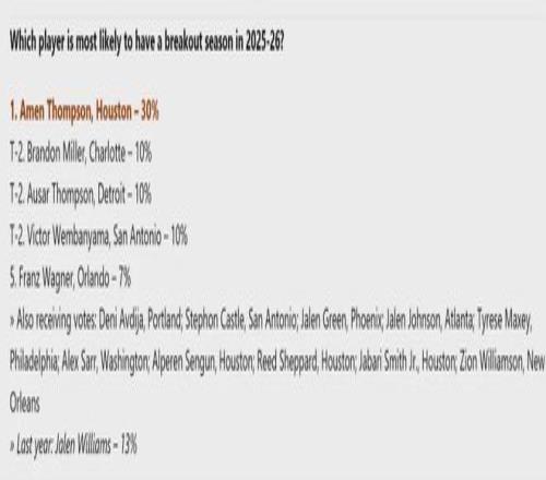 杜蘭特此次降薪正是為了幫火箭減輕薪資壓力,續(xù)約伊森和阿門-湯普森。今年休賽期,NBA官方組織各隊總經(jīng)理投票,阿門在兩項投票中排名第一:1、新賽季最可能爆發(fā)的球員(文班等人并列第二);2、運動天賦最出色的球員(愛德華茲第二)。